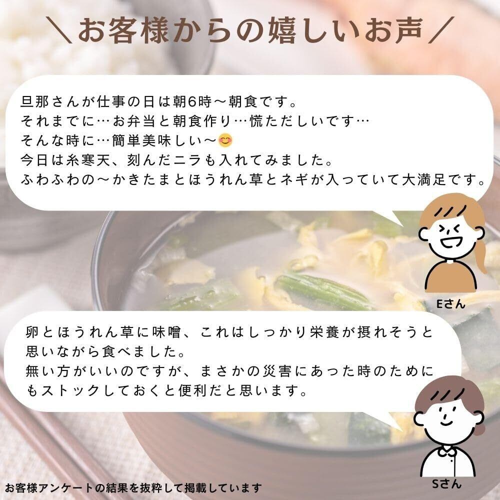 特徴:ヨード卵・光を100%使用。かきたま・ほうれん草・ネギの具材で食べ応えのある一品。赤味噌・白味噌の合わせ味噌で飽きのこない味わい。フリーズドライ製法で、お湯を注ぐだけの簡単調理。