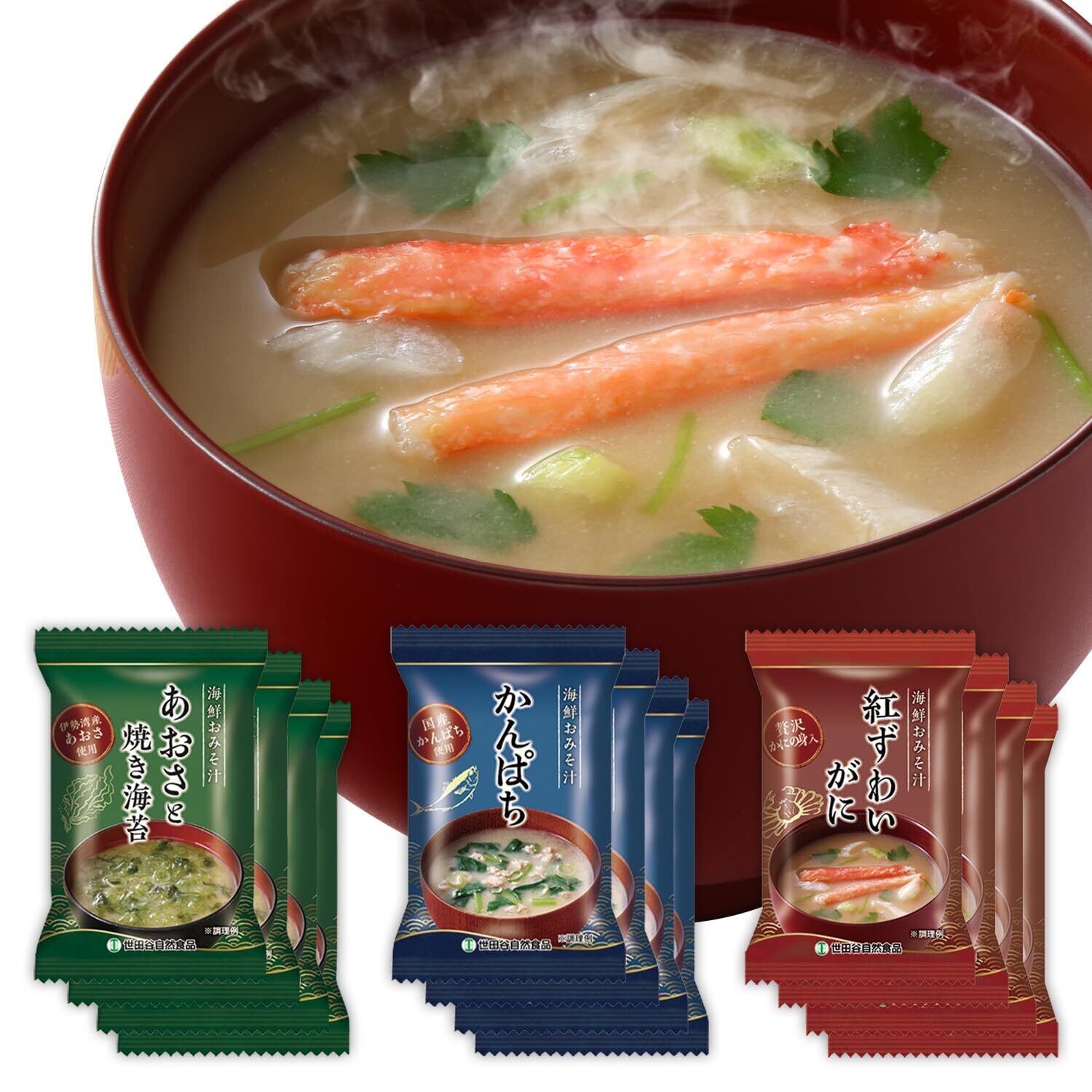 世田谷自然 海鮮おみそ汁 (紅ずわいがに かんぱち あおさと焼き海苔 各4食セット / 12食入) 蟹味噌汁 カニ ずわいがに 魚介 旨味 海鮮 アオサ のり 海苔 フリーズドライ 災害用 保存食 御歳暮 固形 インスタント 即席味噌汁 具だくさん 具材 野菜 塩分控えめ