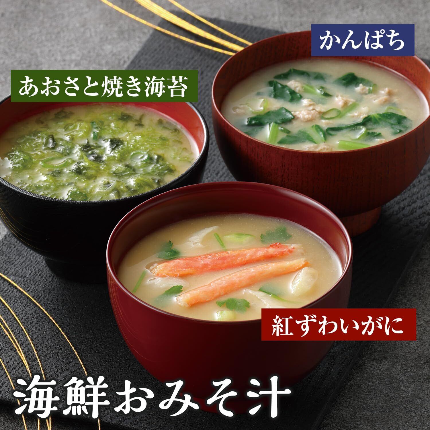 【贅沢な海鮮の旨みと香り】海鮮おみそ汁 かにの旨みが引立つ「紅ずわいがに」、魚介の旨みたっぷりの「かんぱち」、風味豊かな「あおさと焼き海苔」の、こだわり素材を使用したみそ汁3種セットです。