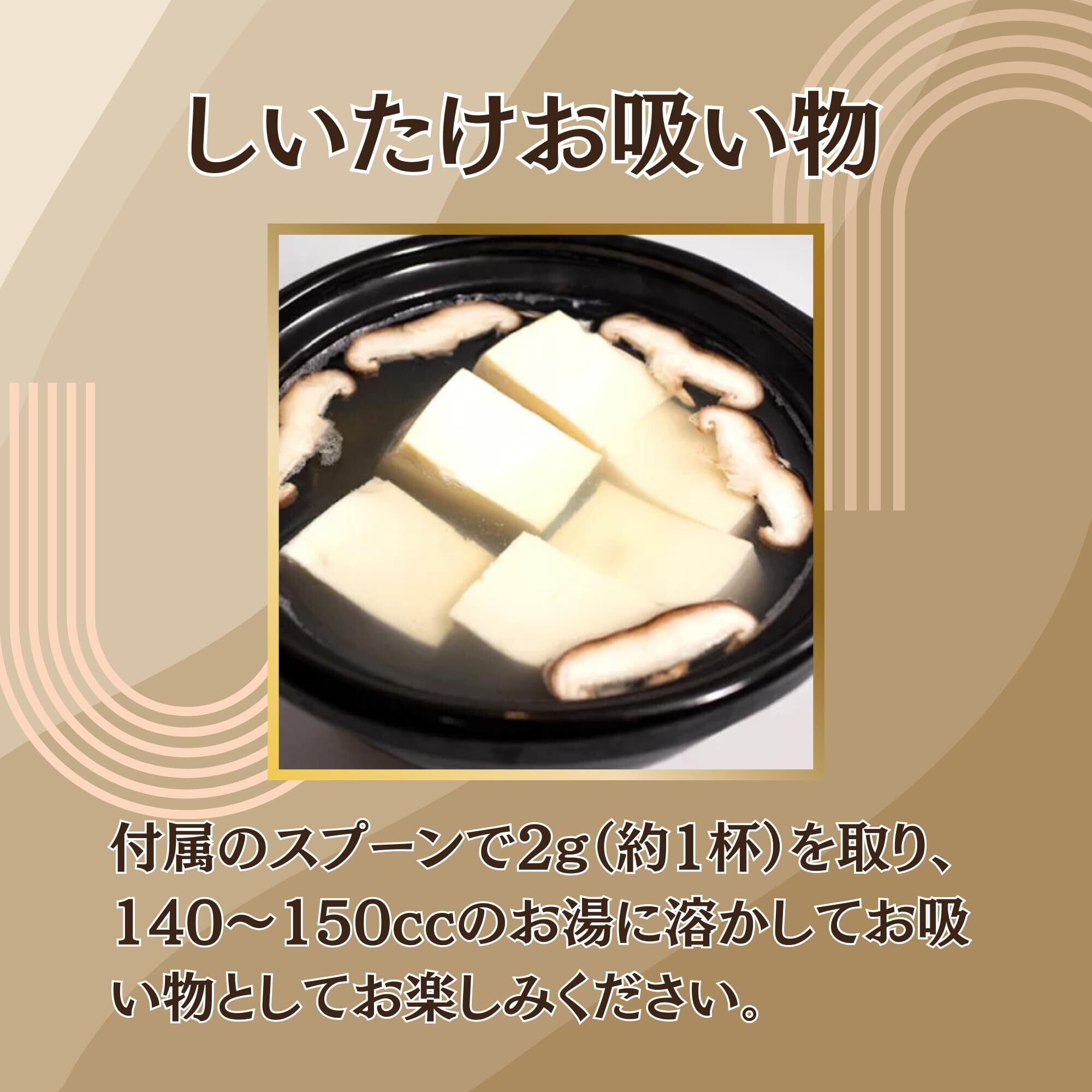すり切り1杯(2g)を150ccのお湯で溶くだけで、簡単に椎茸のお吸い物の出来上がりです。