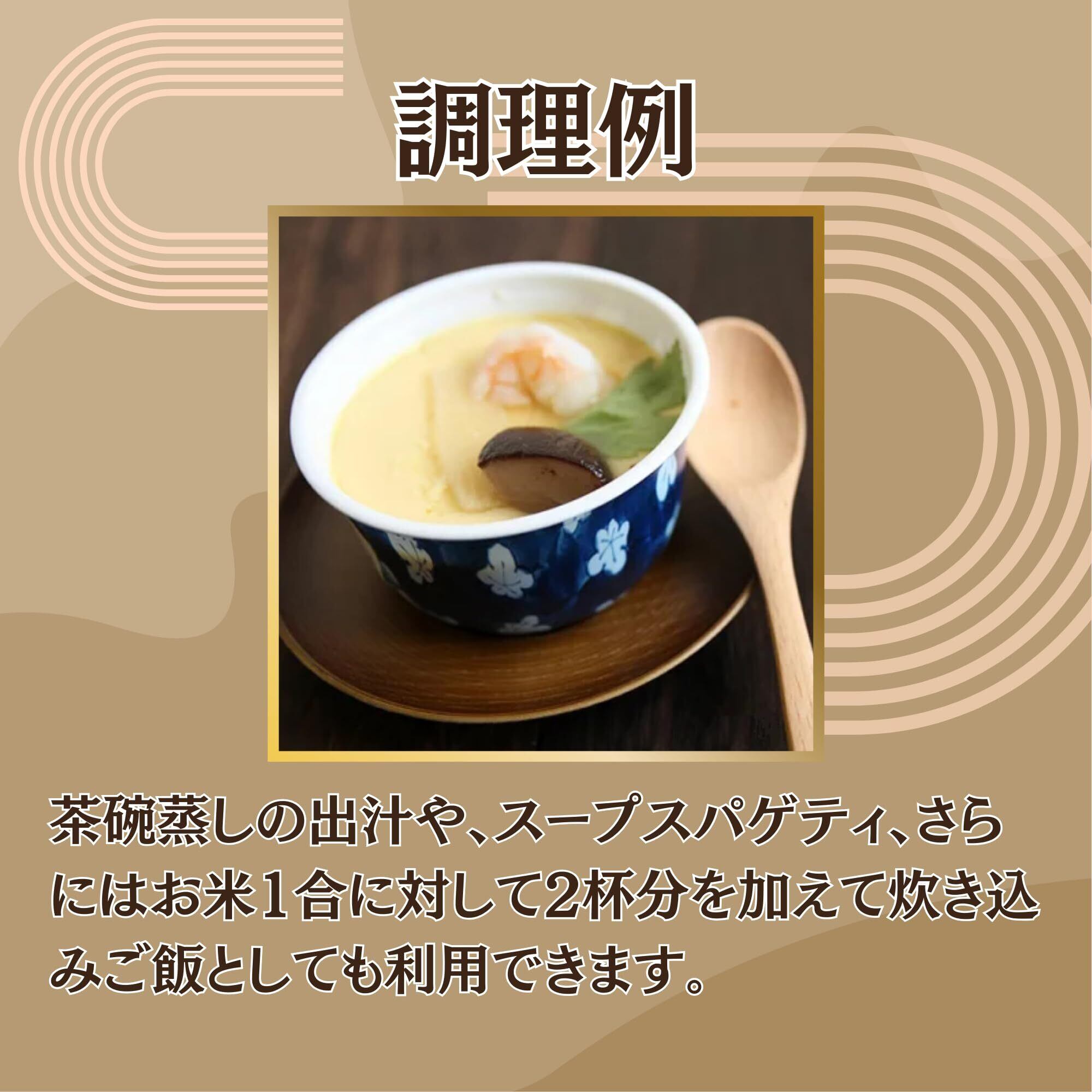 お味噌汁、お鍋、おでんの出汁にも使用できます。茶碗蒸し、出汁巻き卵等、お好みの食べ方でお楽しみください。