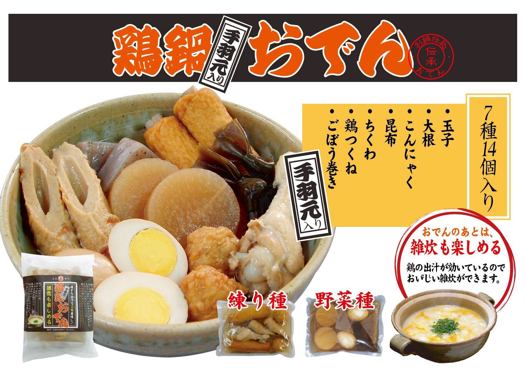 国産野菜種4種8品(玉子2個、大根2個、昆布2個、こんにゃく2個)、練り種4種7品(特製ちくわ2個、ごぼう巻2個、鶏つくね2個、手羽元1本)を別々に煮込みました。