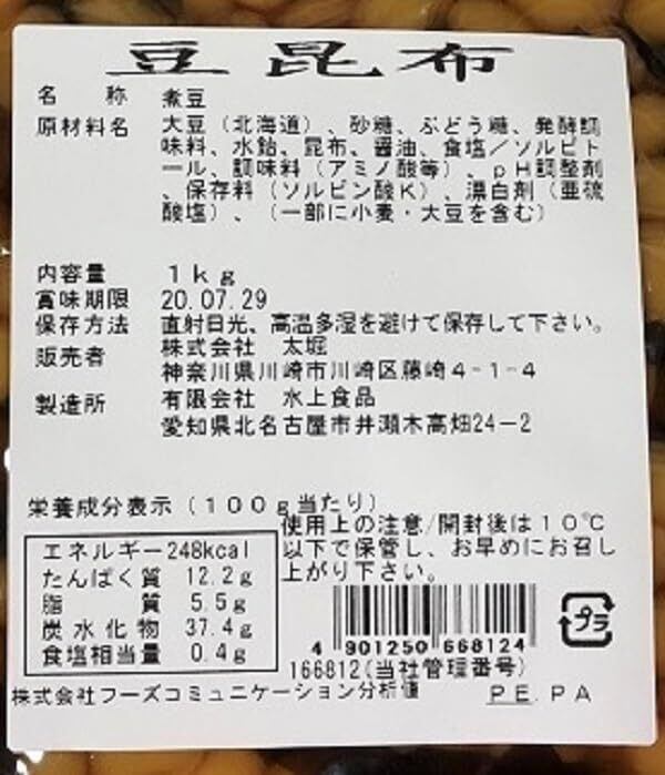 原材料:大豆(北海道)、砂糖、ぶどう糖、発酵調味料、水飴、昆布、醤油、食塩/ソルビトール、調味料(アミノ酸等)、pH調整剤、保存料(ソルビン酸K)、漂白剤(亜硫酸塩)、(一部に小麦・大豆を含む)