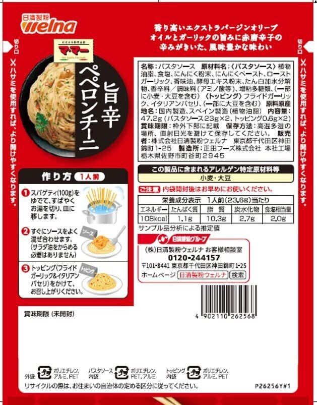 <パスタソース>植物油脂、食塩、にんにく粉末、にんにくペースト、ローストガーリック、香味油、酵母エキス粉末、たん白加水分解物、香辛料/調味料(アミノ酸等)、増粘多糖類、(一部に小麦・大豆を含む) <トッピング>フライドガーリック、イタリアンパセリ、(一部に大豆を含む) 原料原産地名 国内製造、スペイン製造(植物油脂)