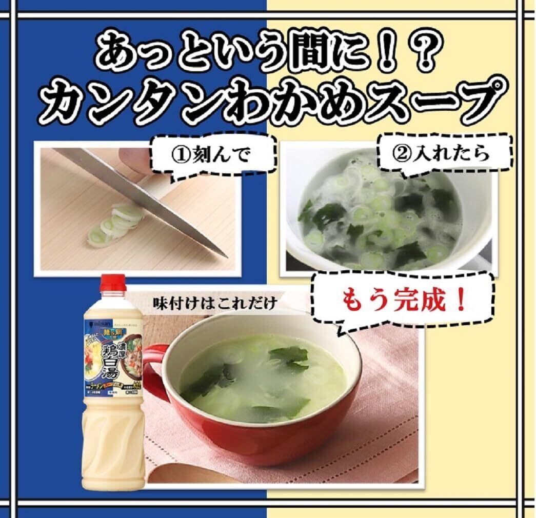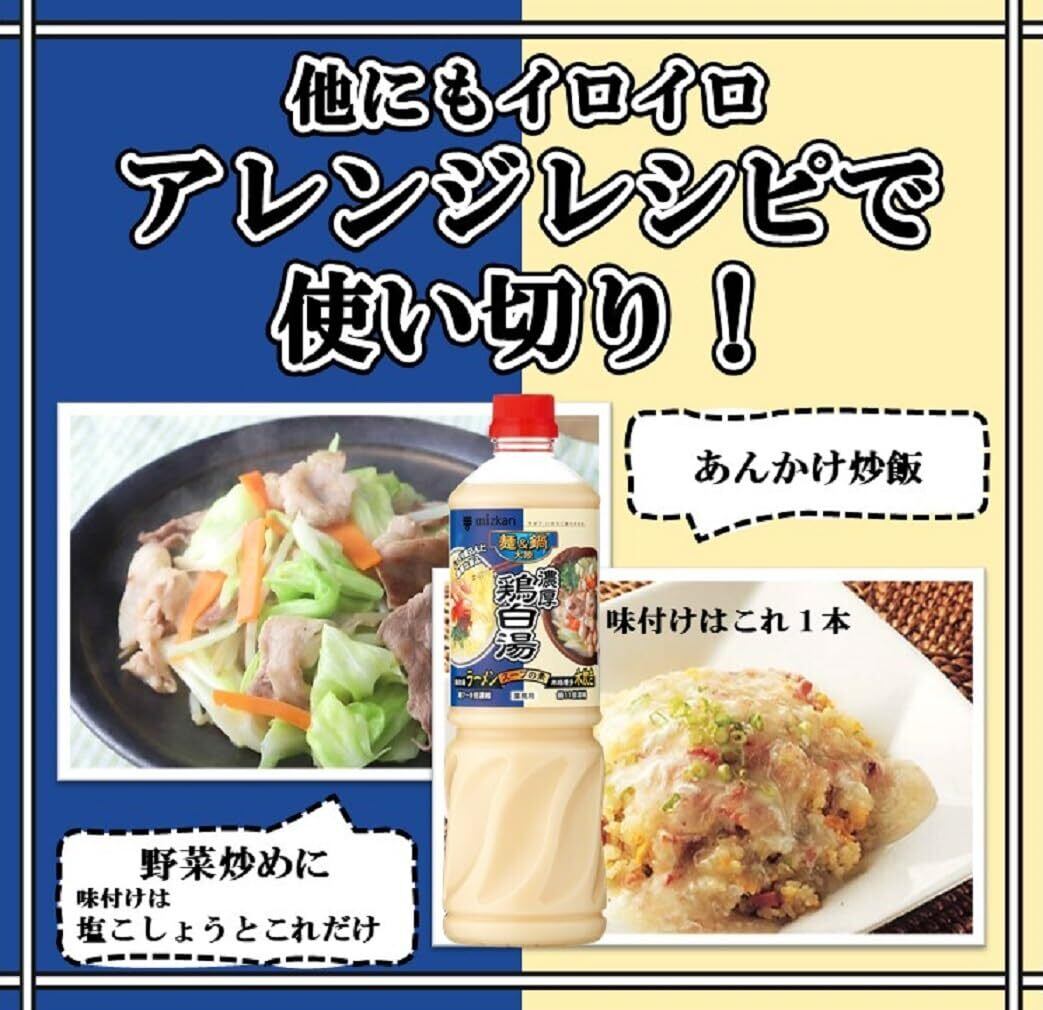 原材料:チキンパイタン(国内製造)、食塩、チキンエキス(卵・乳成分を含む)、鶏脂、なたね油、砂糖、アミノ酸液(大豆を含む)、乳たん白、おろしにんにく、醸造酢/調味料(アミノ酸等)、増粘剤(キサンタンガム)、乳化剤(大豆由来)