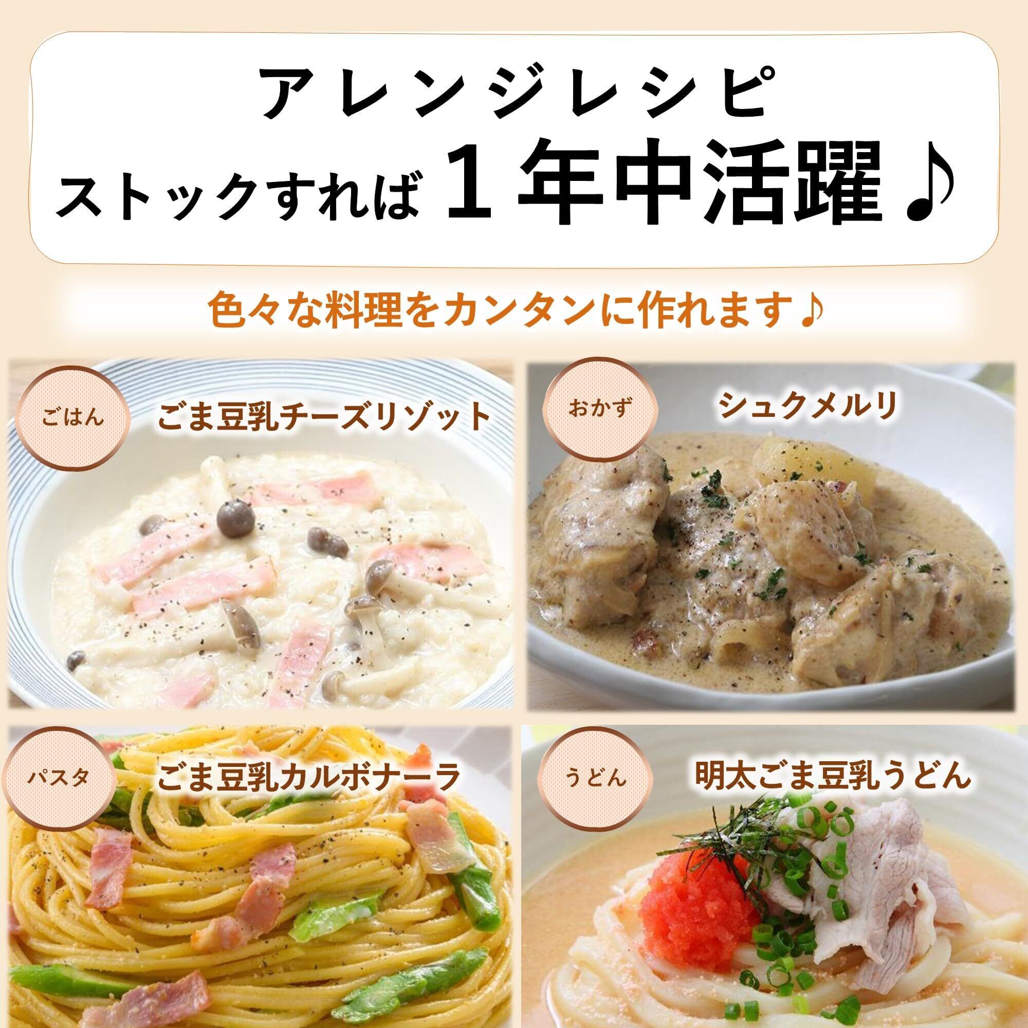 砂糖(国内製造)、すりごま、ねりごま、豆乳(大豆を含む)、食塩、大豆粉末、鶏がらだし、ごま油、豚脂、酵母エキス、香味油、こんぶだし/調味料(アミノ酸等)、レシチン(大豆由来)、炭酸カリウム