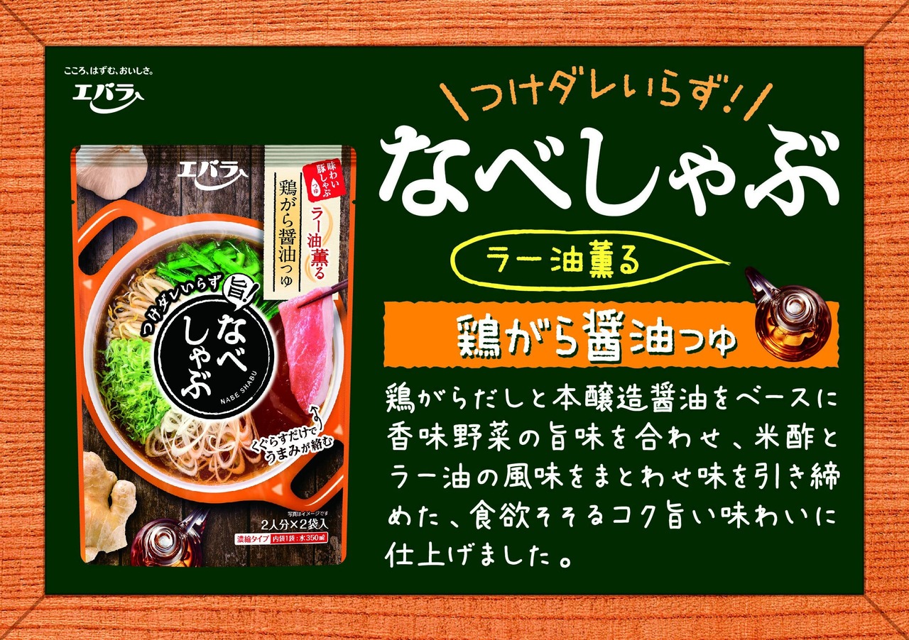 この「エバラ なべしゃぶ 鶏がら醤油つゆ」で、楽しい鍋のひとときを演出しながら、家族や友人との暖かい時間をお過ごしください!