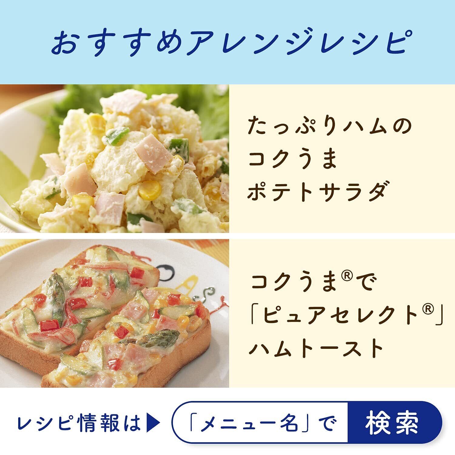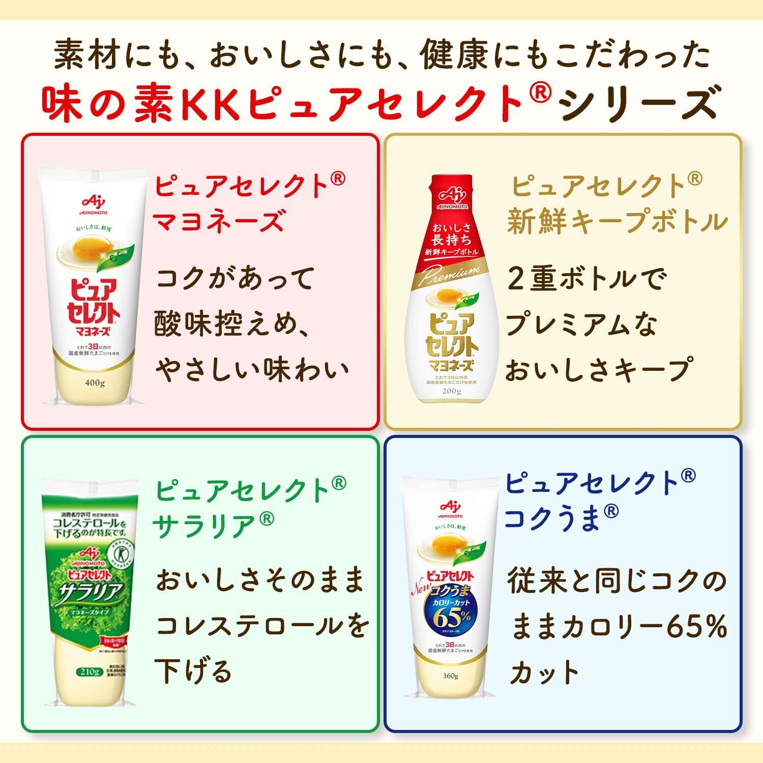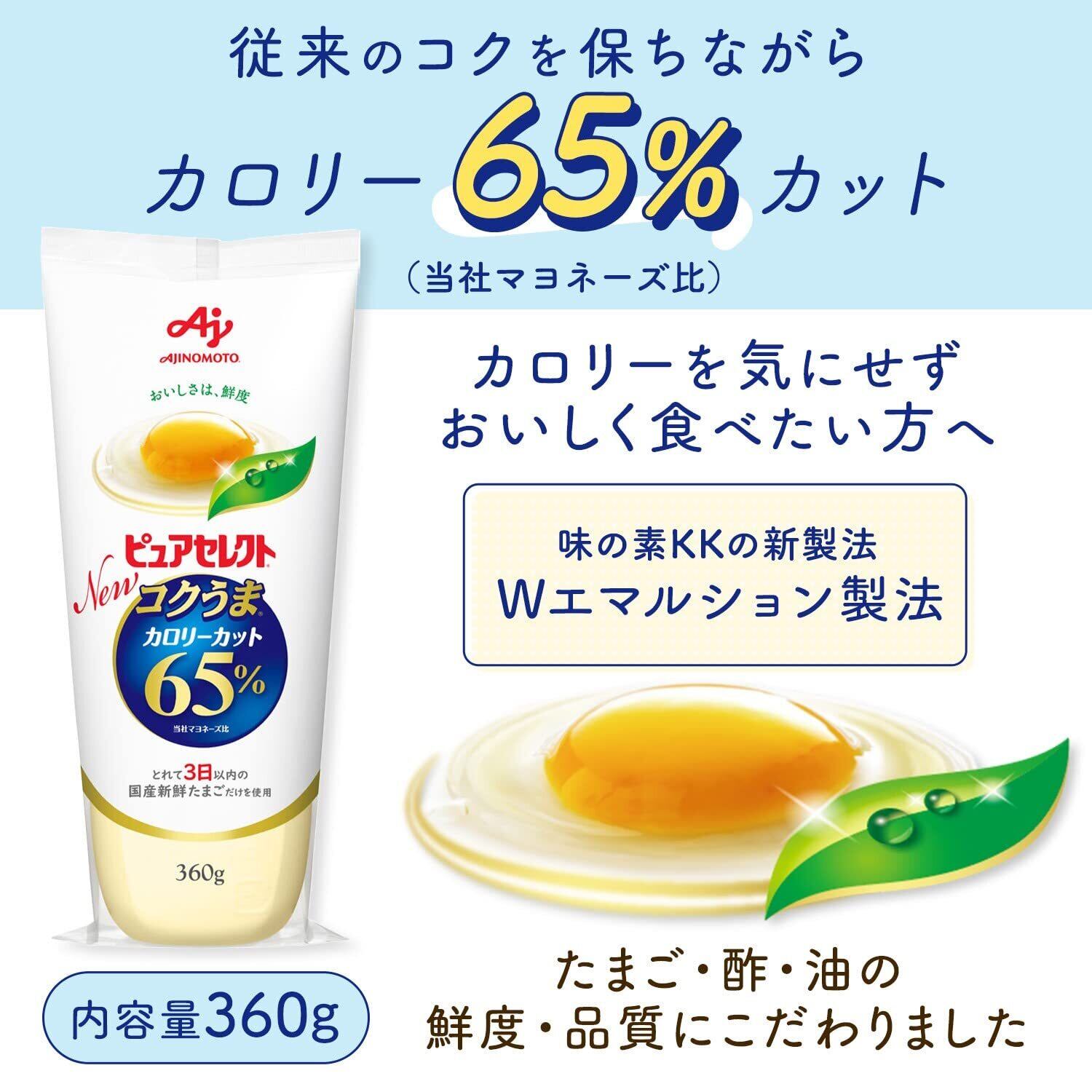 味の素KKの特許製法「Wエマルション製法」により、カロリー65%カット※でありながら、レギュラーマヨネーズと同様のコクを実現した、酸味控えめなやさしい味わいのマヨネーズタイプです。(※「ピュアセレクト マヨネーズ」比)