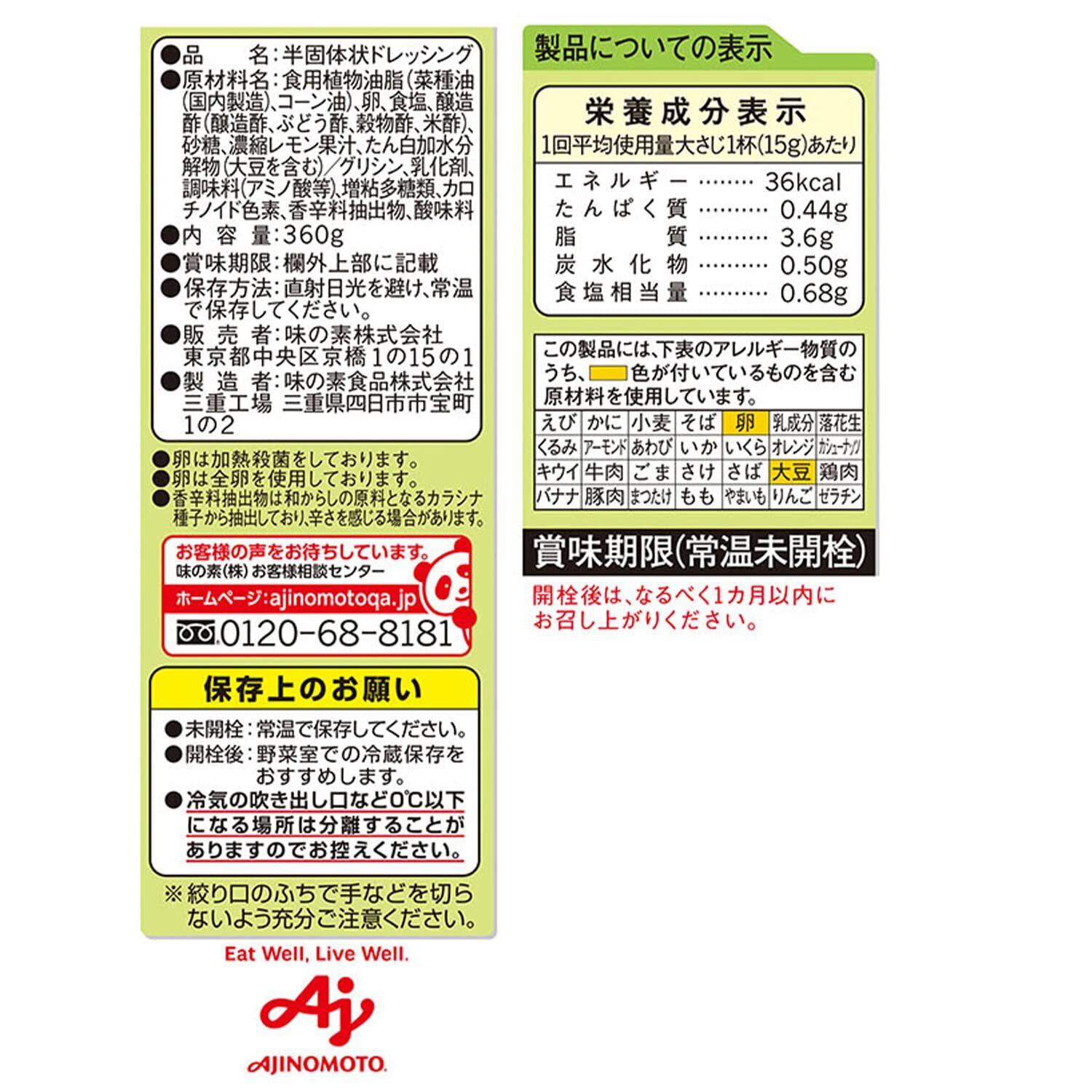 原材料:食用植物油脂(菜種油、コーン油)、卵、食塩、醸造酢(醸造酢、穀物酢、ぶどう酢)、砂糖、濃縮レモン果汁、たん白加水分解物(大豆を含む)/グリシン、乳化剤、調味料(アミノ酸等)、増粘多糖類、酸味料、香辛料抽出物、カロテン色素