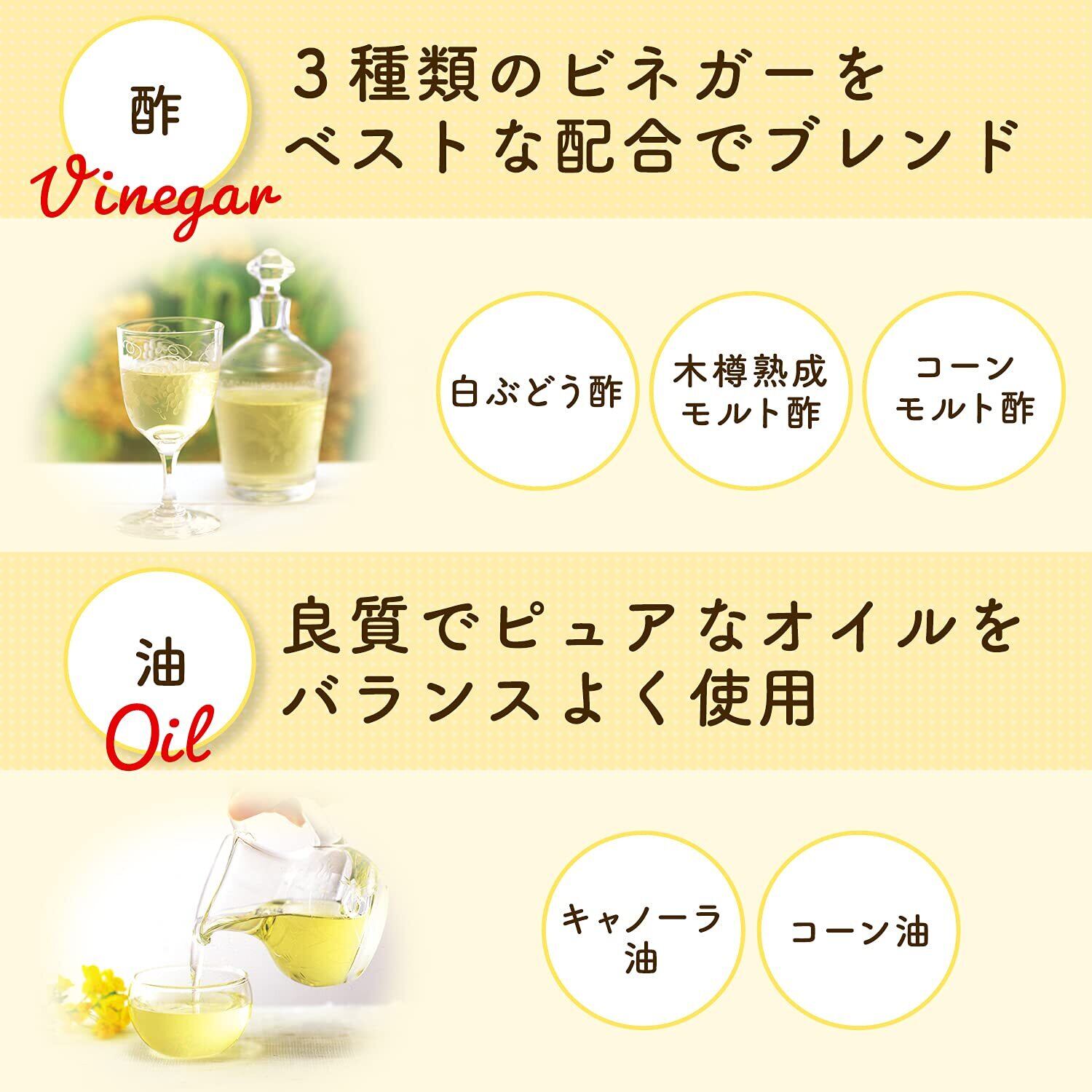 酢は、熱を加えたまろやかなお酢に、白ぶどう酢・木樽熟成モルト酢・コーンモルト酢をブレンドして使用しています。