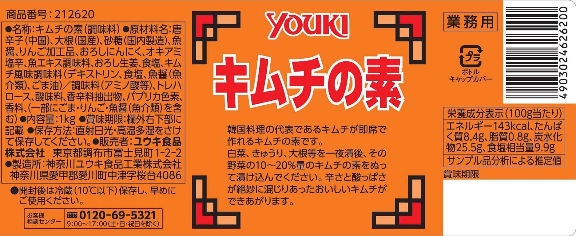 原材料:唐辛子(中国)、大根(国産)、砂糖(国内製造)、魚醤、りんご加工品、おろしにんにく、オキアミ塩辛、魚エキス調味料、おろし生姜、食塩、キムチ風味調味料(デキストリン、食塩、魚醤(魚介類)、ごま油)/調味料(アミノ酸等)、トレハロース、酸味料、香辛料抽出、パプリカ色素、香料、(一部にごま・りんご・魚醤(魚介類)を含む)