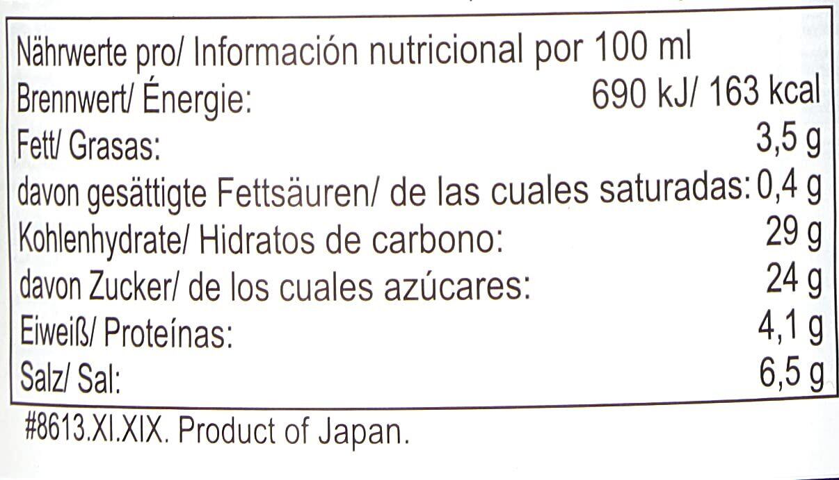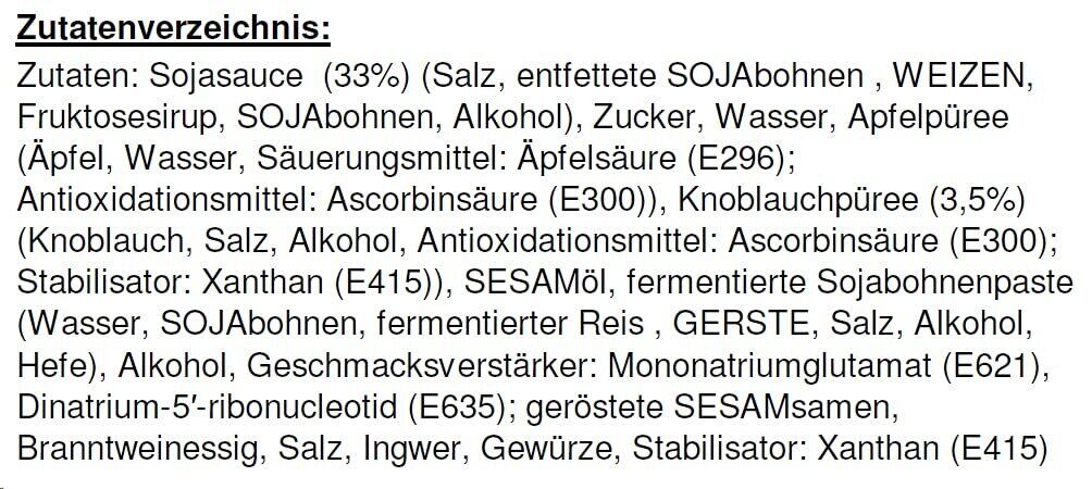 原材料:しょうゆ、砂糖、りんご、香味野菜(にんにく、生姜)、ごま油、みそ、ごま、醸造酢、食塩、香辛料、酒精、調味料(アミノ酸等)、増粘剤(キサンタン)