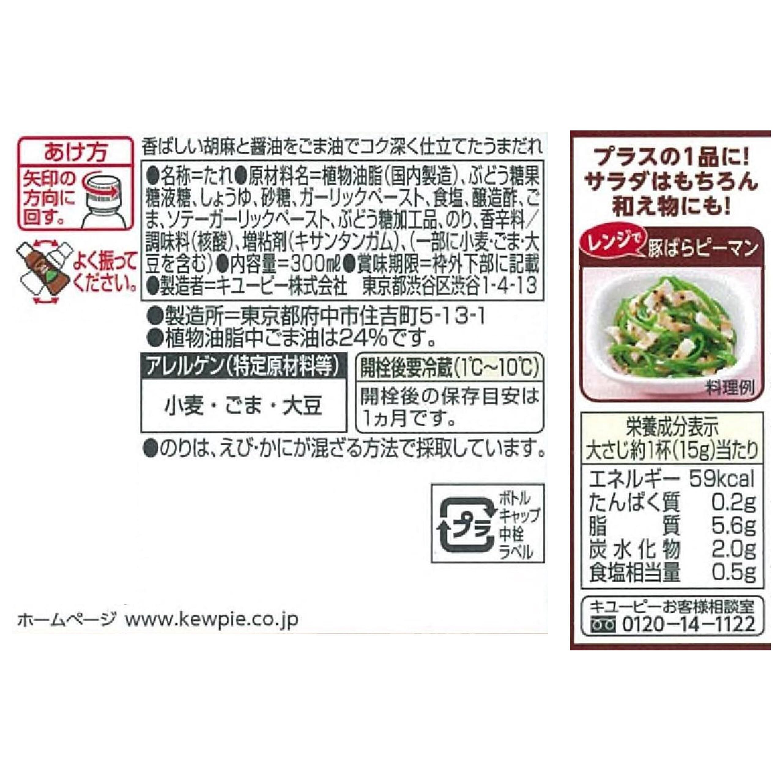 植物油脂(国内製造)、ぶどう糖果糖液糖、しょうゆ、砂糖、ガーリックペースト、食塩、醸造酢、ごま、ソテーガーリックペースト、ぶどう糖加工品、のり、香辛料/調味料(核酸)、増粘剤(キサンタンガム)、(一部に小麦・ごま・大豆を含む)