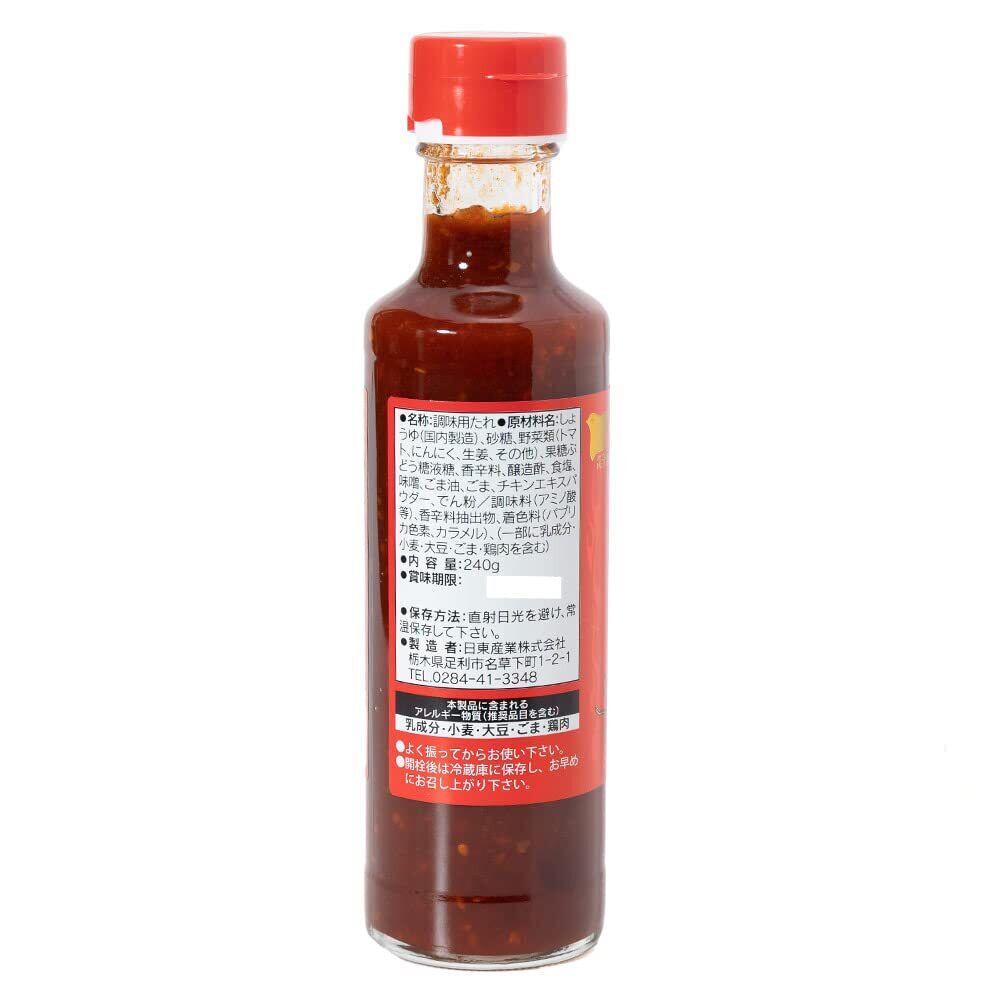 原材料:しょうゆ、砂糖、果糖ぶどう糖液糖、野菜・果実(トマト、にんにく、生姜、その他)、香辛料、醸造酢、食塩、味噌、ごま油、ブイヨン、ごま、でん粉、調味料(アミノ酸等)、香辛料抽出物、パプリカ色素、カラメル色素、(原材料の一部に小麦、乳、大豆、ごま、鶏肉を含む)
