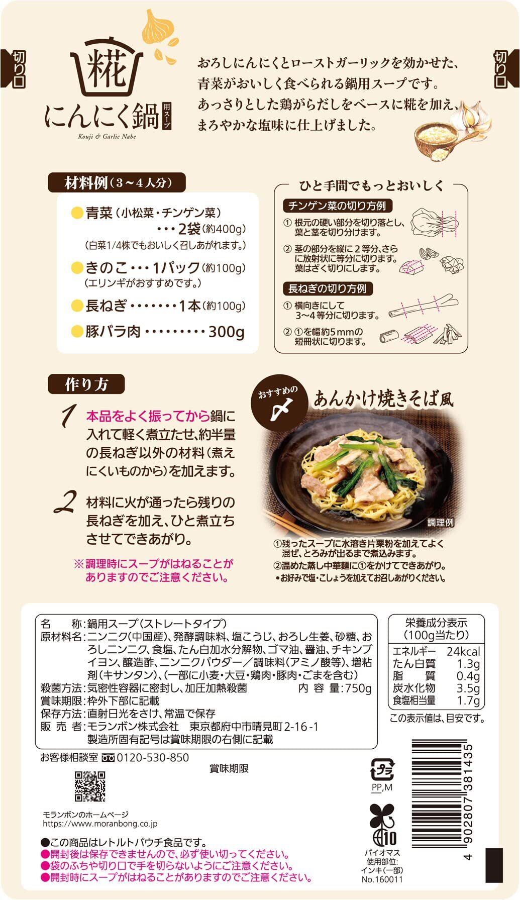あっさりとした鶏がらだしをベースに糀を加え、旨みのあるまろやかな塩味に仕上げました。おろしにんにくとローストガーリックの2種類のにんにくを加え、青菜がおいしく食べられます。にんにくが効いたスープが野菜に絡んで、青菜(小松菜・チンゲン菜)がやみつきになるおいしさです。