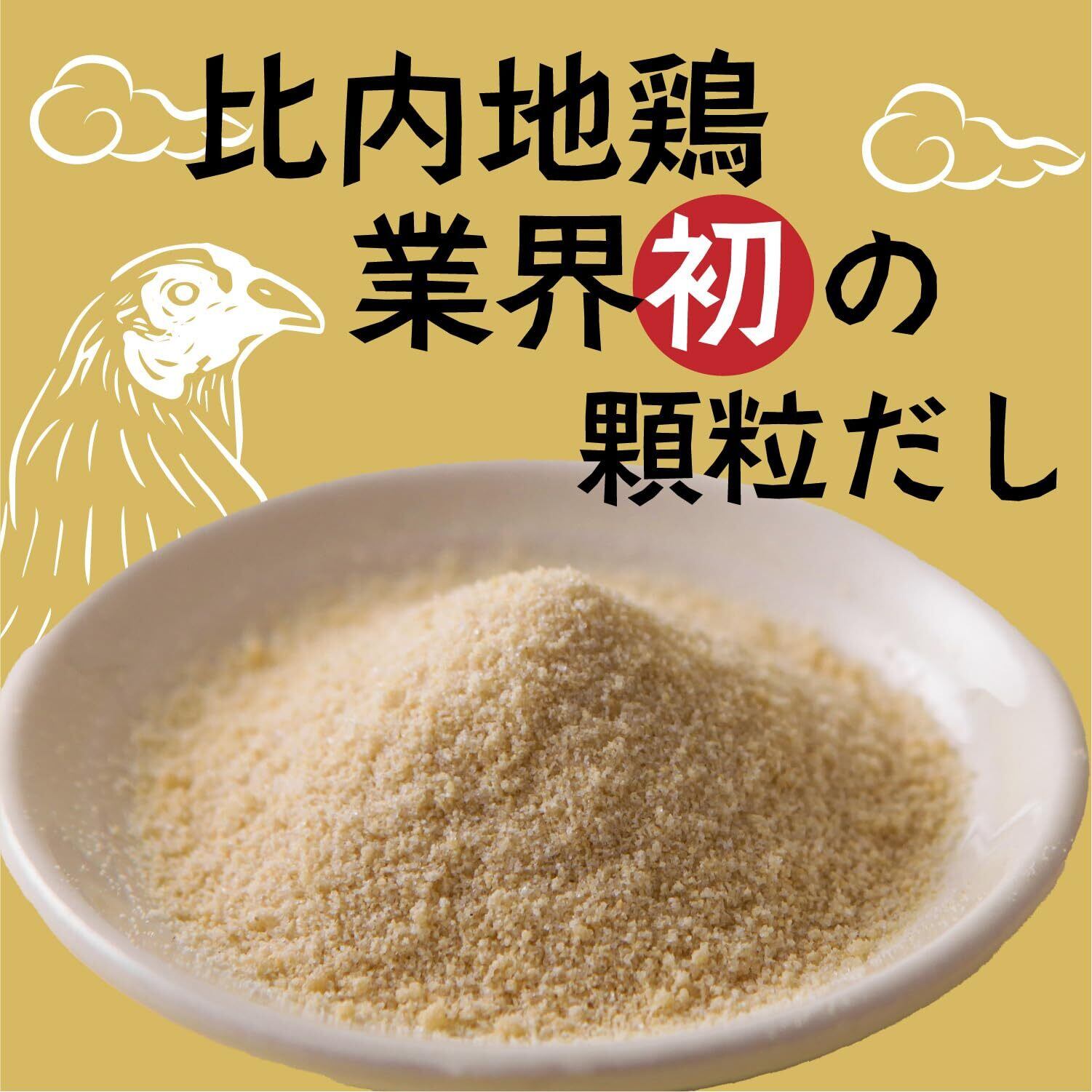 【比内地鶏丸鶏ガラを100%使用】比内地鶏業界初の顆粒状のだしの素。 比内地鶏の丸鶏ガラを煮出したスープを顆粒状にして、旨味を凝縮。 スープでも炒め物でも使いやすく仕上げました。