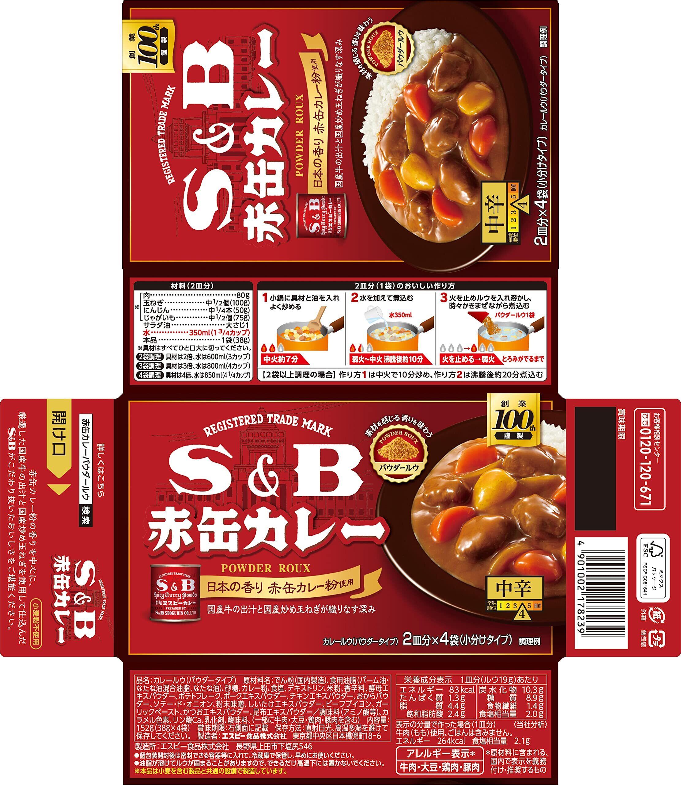 赤缶カレー粉の香りを中心に、厳選した国産牛の出汁と国産炒め玉ねぎを使用して作り上げた、S&Bがこだわり抜いたおいしさのパウダールウ。小麦粉不使用。