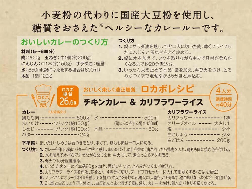 小麦粉の代わりに大豆粉を使用したカレールー。小麦粉を使用したカレールーと比べて1人前25%の糖質カットを実現しました。