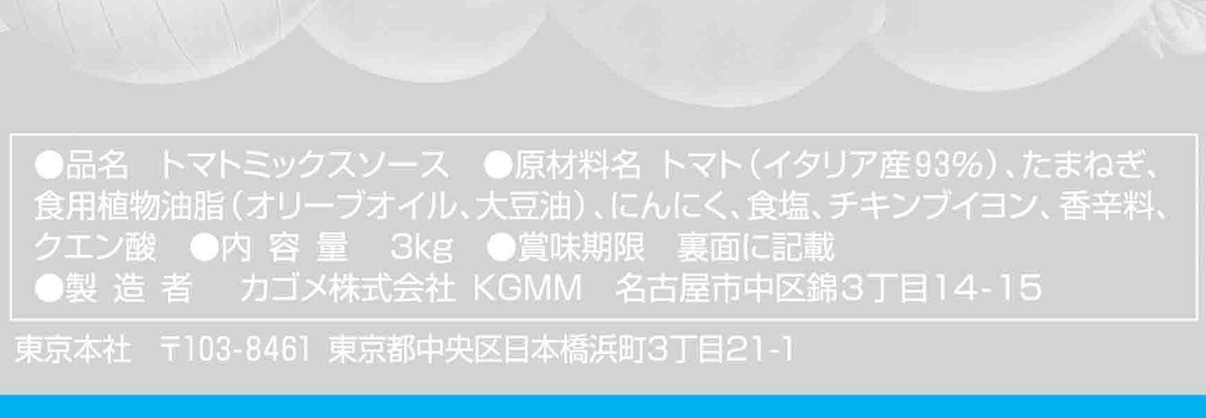 原材料:トマト(イタリア産93%)、たまねぎ、食用植物油脂(オリーブオイル、大豆油)、にんにく、食塩、チキンブイヨン、香辛料、クエン酸