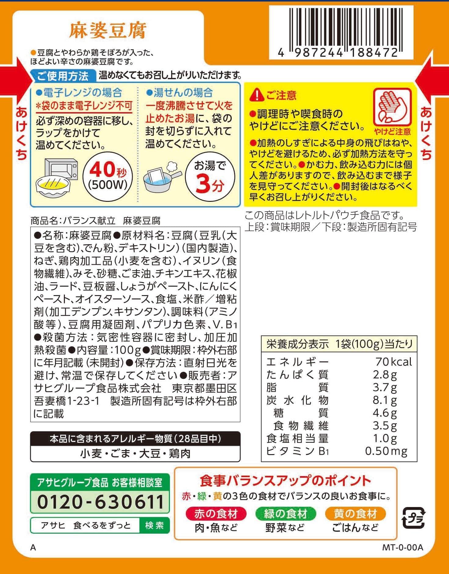 豆腐(豆乳(大豆を含む)、でん粉、デキストリン)、ねぎ、鶏肉加工品(鶏肉、パン粉(小麦を含む)、たまねぎ、でん粉、食塩)、牛コラーゲンペプチド、砂糖、みそ、ごま油、香辛料、チキンエキス、花椒油、ラード、豆板醤、オイスターソース、食塩、米酢/増粘剤(加工デンプン、キサンタン)、調味料(アミノ酸等)、カラメル色素、パプリカ色素、V.B1