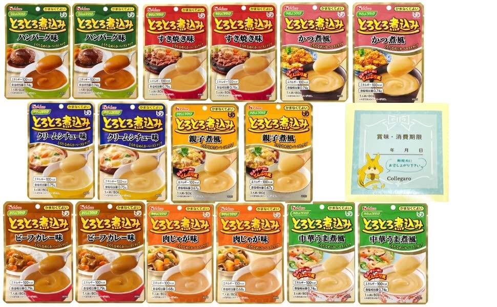 [Collegaro]とろとろ煮込み8種×2食。合計16食 やさしくラクケア かまなくてよい とろとろ煮込み(区分4)Luttyオリジナル期限ステッカー付 計16食(8種類×2)ビーフカレー味クリームシチュー味肉じゃが味すき焼き味ハンバーグ味親子煮風かつ煮風中華うま煮風一食80gエネルギー1食100cal 【ユニバーサルデザインフード区分 かまなくてよい】